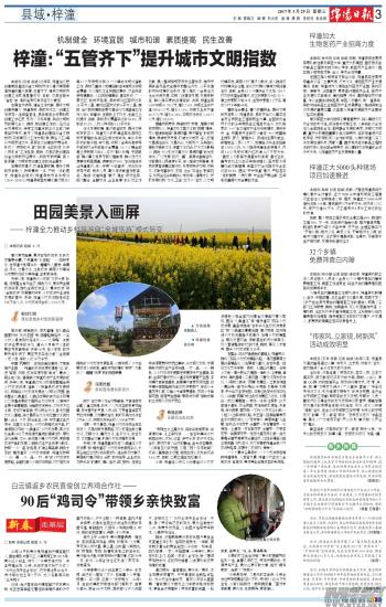 去年以来,梓潼县重点抓住“九曲潼江乡村旅游带”和“锦绣潼东”乡村旅游走廊两条线,利用各自区位优势与资源优势,结合新农村建设、美丽新村建设规划,采取“政府主导,企业运作,农民参与”的模式,精心组织,部门联动,促进各类资源要素向示范区集中,兴办现代农场,发展特色休闲农业产业观光园,一村一品,一乡一特色,为乡村旅游发展奠定规模观光产业基础。目前,全县已建成宏仁乡潼江印象葡萄产业园、许州镇万亩蜜柚基地、自强镇千亩荷花观光园、石牛镇千亩胭脂脆桃生态旅游度假村、定远乡十里花卉长廊、双峰乡千亩柑果基地、东石乡千亩梨花园、百菇养生园等“果蔬与休闲”相映成辉的立体现代农场示范区。