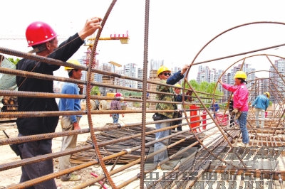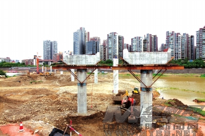 昨(25)日,记者在高新区双碑大桥施工现场看到,14根桥梁桩基已经矗立河中,大型工程机械往来穿梭,几十名工人正在各自的岗位上紧张作业。据工程项目部相关负责人介绍,整个工程的水下施工作业已进入尾声,即将全面转入水上施工作业阶段。双碑大桥是分流飞云大桥交通压力,增强高新区南北交通联系的重要交通惠民工程。大桥跨越安昌河,桥梁与河道斜交,全长约620米,宽8.75米—16米,最大跨径组合为46米+60米+46米的预应力砼连续梁桥。(实习记者 任露潇 摄)