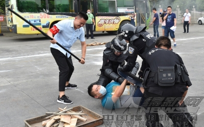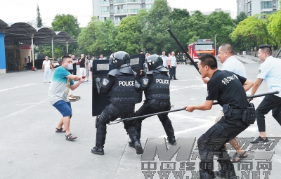 巡特警机动一大队快速出警,2分钟内赶到现场,对持刀“歹徒”进行突袭制伏,将其押走。随后,另一名“歹徒”见行凶