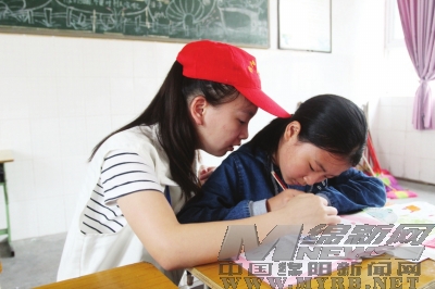 志愿者为留守儿童辅导作业