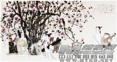 何多俊告诉记者,《辛夷仕女》是他特地为香港特区政府成立20周年所创作的作品。早在今年年初他便开始动笔、构思,历时一个月,共创作了三、四幅作品,最终选择了这幅《辛夷仕女》。画作中展示的是一群相约于辛夷花下的仕女,她们有的拿着纨扇与闺蜜贴耳谈心,有的手执古籍吟诗作对,有的正抬头看花,生怕错过了一丝美景……满树辛夷花开,微风拂动,花落飘香,好不惬意。在何多俊的笔下,辛夷花的美与仕女们的美浑然天成,融为一体,“人在花中笑,画中花更娇”的景致瞬间跃然纸上。