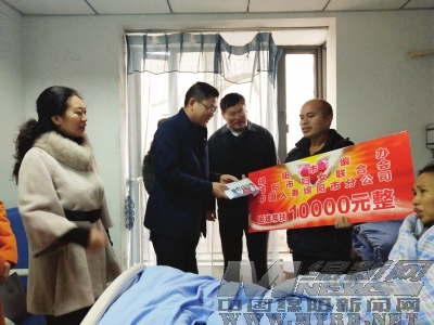 本报讯(蒋勇 记者 田明霞 文/图)昨(13)日上午,来自市编办、市妇联、中国人寿绵阳市分公司的负责人,走进绵阳市德康疼痛医院四楼的病床前,将一万元帮扶金送给了患宫颈癌的杨大容(如图),鼓励她战胜病魔,早日康复。