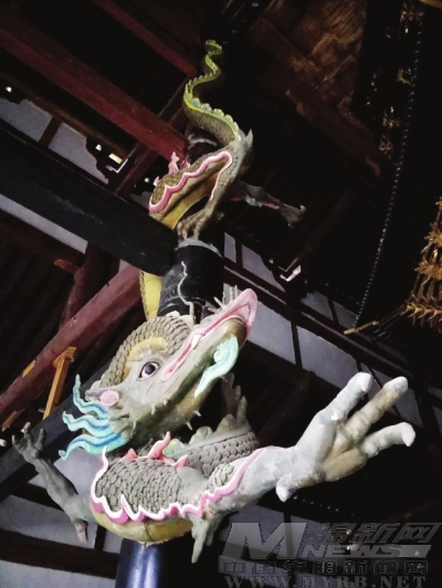 如今映入眼帘的云岩寺大殿,形制古朴。整座大殿支撑用的柱头,从四周渐往中间收拢,这是宋元时期侧角建筑形制。此外,大殿7.2米的开间,却只用了一个铺作(即明清所称的“斗拱”)。廖大勇说,这是因为宋元时期的建筑更多走简朴、大气的路线,因此很难看到明清建筑中层层叠叠的精巧斗拱。在大殿的一层补间铺作蜀柱上,还能看到鹰嘴造型,这也是宋元时期流行的一种制作工艺。大殿的抹角梁原本因为糟朽已经断裂,他们从梁的上面加入可逆的现代钢构,撑起了这根宋代构件。