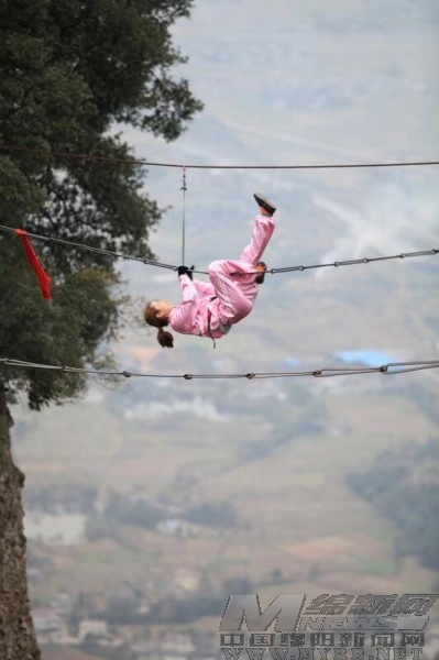 江油窦圌山铁索飞渡的重要载体就是横跨三座山峰的铁索桥。铁索分上下两根,分别为手链和脚链,手链为160环,脚链78环,近40米长度。铁索飞渡传承人杨海平独创的表演已成为窦圌山一个重要的景观。
