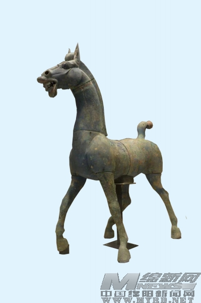 1990年出土于绵阳何家山二号墓的青铜马高达134厘米,造型优美,体态矫健,整体呈行走姿态。青铜马前方的牵马俑身高仅有68厘米,这是汉代人为了衬托马的高大骏美,特意将牵马俑矮小化的一种艺术体现。