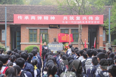 本报讯(张衡 文/图)10月28至29日,江油一中高2018级全体师生分两批次来到位于梓潼长卿山下的两弹城,开展以“传承两弹精神,共筑复兴伟业”为主题的爱国研学活动,重温革命先辈们艰苦卓绝的奋斗历史,感受“两弹元勋”无私奉献的爱国精神。