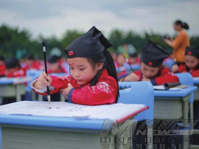 书写人 立天地 人生聪明识字始,写字识字是学习文化的第一步,描红笔画简单而意义深远的大楷“人”字,寓意着在人生的启蒙阶段,学会做人是最重要的。学童们在左老师的带领下把这个“人”字写得堂堂正正、稳稳当当、神采飞扬、气势非凡(如图)。