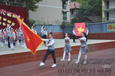活动在激扬的出旗曲中拉开帷幕,三名出旗手昂首阔步向前、向前、向前(如图)……队员们注目着鲜艳的五星红旗,嘹亮的《中国少年先锋队队歌》唱响,歌声激荡在校园的每一处角落。接着小主持人宣读新一届大队委员名单,新一届大队委神采飞扬地走上主席台和大家见面,各校区的领导班子和年级组组长为新一届大队委佩戴标志。掌声结束后由大队长带领全体大队委许下就职誓言,学生喊出了“准备着,为共产主义事业而奋斗”的豪言壮志,庄严的仪式感染、教育着每一位成小学子。为了庆祝这个光荣的日子,各校区大队辅导员代表各中队发表讲话,讲话内容包含着浓浓的深情和谆谆教诲。在这个共同的节日,同学们用歌声、乐声、书画为祖国献礼为自己庆贺。仪式结束后新一届大队委又用实际行动来体现他们的铿锵誓言,扫地、擦灰、拾垃圾……那么认真那么仔细而坚定。