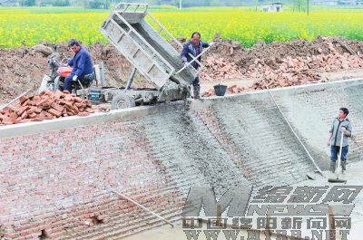 “快了快了!差不多再有一个月就完工了。”在涪城杨家镇柏林湾村一处油菜地旁边,一条新建水渠穿过平坦的乡村公路,连接起了道路两旁的大片土地。水渠一头,10多名村民正在大型机械挖出的渠道内两侧砌砖、打混凝土,现场一片忙碌。“这是政府出资修建的,去年11月份就开工了,修完后既能灌溉又能排洪,真是解决了大问题。”参与施工的李道富开心地说。据了解,新建水渠处原来是一条宽两米左右的小河沟,每年夏季排涝、土地灌溉都会受到不同程度的影响。为解决农户们的“烦心事”,在去年,涪城区有关部门积极促成解决此事,在原来河沟的基础上开挖一条上口宽7米、渠底宽4米、长1560米的砖混结构水渠。施工方负责人介绍,这条水渠在今年4月建成后,将发挥排涝灌溉功能,惠泽柏林湾村、高山寺村的7个组的村民。柏林湾村一位村民谈及此事,笑得合不拢嘴,他说:“这真是一件办进我们老百姓心坎里的大好事啊。”