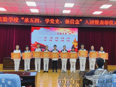 本报讯(贾青青 文/图)今年是中国共产党成立100周年,为进一步树立典型,表彰先进,激励和引领广大团员青年“承五四学党史强信念跟党走”,在中共江油实验学校总支委员会的指导下,江油实验学校团委于4月29日举行了2021年新团员入团仪式暨“五·四”表彰大会(如图)。