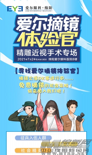 记者还了解到,绵阳爱尔在招募“摘镜体验官”,不管你是渴望迈进理想专业的准大学生、是追求“睛”彩蜕变的职场人士,又或是想要应征入伍的热血青年,只要你个性鲜明、积极向上勇于展现自我,就来报名参加吧!投票通道已经开启,7月24日上午9:00活动现场宣布票数结果,在白领、大学生、征兵三大类人群中各选出票数第一名作为爱尔摘镜体验官,精雕近视手术免单。除去三名免单名额以外,三大类人群中总票前5名享8000元摘镜助力金;票数6-10名享6000元摘镜助力金。睛彩视界,与EYE同行!扫描二维码进入报名通道,快来报名吧。
