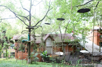 在126文化创意产业园里,最特别的就是民宿,尤其以树屋最有名。园内的树屋大都是三角形的木建筑,悬架在几棵大树上,看上去虽然一般,住进去的感觉却十分奇妙,特别是到了晚上,树屋顶上的灯都亮了,四周一片通明,仿佛住进了森林的发光屋,很美、很治愈。树屋的面积有限,进房就得换鞋,房间内没有多余的家具物品,仅有一张床和一个狭小的卫生间,却也能让住客感到温馨与舒适。