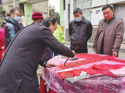 在活动现场,嫘祖书画学院的老师们忙着写春联,参加活动的社区居民也没闲着,将写好的春联整理好、晾干墨迹。欢声笑语中,一句句美好的祝福跃然纸上,浓浓的年味洋溢街巷。