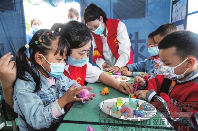 上午9点,在泸定县磨西镇贡嘎广场集中安置点,挂着“青青儿童乐园”纸牌的蓝色帐篷里传出阵阵欢笑声,身着志愿者“红马甲”的磨西镇幼儿园老师陶茜正在教20多名孩子念古诗、猜灯谜。