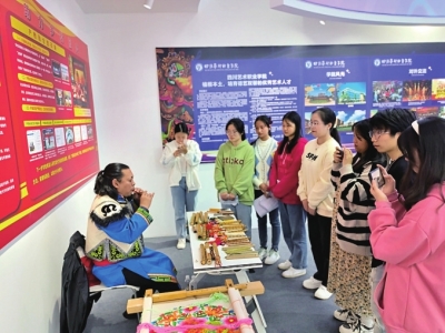 展会期间,出席全省职业教育深化产教融合现场推进会的领导嘉宾,四川水利职院、泸州职院等众多高职院校师生莅临学校展位参观学校的羌绣和羌笛展演,了解羌文化(如图)。