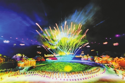 “这就是我们今天故事的主角——阿拉丁神灯……”20时30分,夜幕降临,山间微风拂来,丝路奇幻城度假区大型山水奇幻剧《丝路神灯》精彩上演。数百名演职人员在室外山水实景中,配合着“声、光、电”科技手段,重现着一幕幕古丝绸之路沿途国家的童话故事、奇幻风光与传奇人文,沉浸式的演出赢得阵阵掌声。