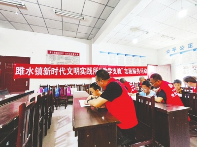炎炎夏日,雎水镇新时代文明实践所化身“家门口”的暑期加油站,机关党员志愿者和学校优秀骨干教师在此开展的助学支教志愿服务活动,受到家长孩子们的一致好评。志愿者们为孩子们带来精彩的心理健康教育课,志愿者还针对孩子们反映的学业困惑,一对一结对帮扶进行引导,激发孩子学习兴趣和求知欲望,让大家在轻松愉悦的氛围中完成暑期作业。