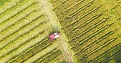 本报讯(彭彬 绵报融媒记者 刘晓东 文/图)当前,梓潼县5.1万亩杂交水稻制种进入成熟季。各个种植基地里,沉甸甸的稻穗压弯了稻秆,阵阵轻风卷起金色波浪,一台台联合收割机在大田里来回收割,处处一派繁忙的丰收景象。