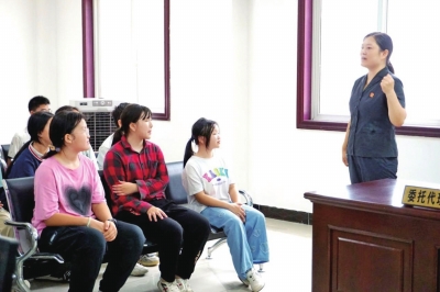 为了让同学们了解法院工作,芦溪法庭主动邀请同学走进法庭参观。同学们体验了安检流程,参观了诉讼服务大厅、家事审判庭、科技法庭、温馨调解室等区域,了解了法庭工作日常、诉讼服务中心设施功能、立案流程以及相关便民服务举措等,实地感受到“智慧法院”的“智慧”和法律的庄严。法官还向同学们讲解了法官、书记员、原告、被告等席位和职责以及法槌、法徽的象征意义。在对审判工作有了更加直观的了解后,同学们有序“换装”,坐到不同席位上,沉浸式融入“法官”“书记员”等角色,通过体验开庭中的各个环节,进一步增加了对法律的敬畏感。