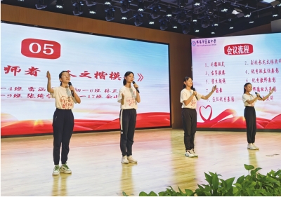 活动现场,同学们为老师们准备了丰富多彩的节目。初一(1)班沈与婧、朱孟轩两位同学表演的古筝《将军令》拉开了表彰活动的序幕。初一(24)班刘原佑同学钢琴伴奏,初一(4)班雷涵婷、初一(6)班林芷娴、初一(9)班张琦悦、初一(17)班和余小路等五位同学表演的诗朗诵《师者,人之楷模也》让大家掌声不断。初一(15)班戴熙乐、李佳蔚、赵梓丹、初一(18)班郑睿国玉、初一(1)班雷潇玉和初一(22)班李诗怡6位同学表演的中国舞《浣溪沙》让活动的气氛达到了高潮。在一阵阵热烈掌声中,在一声声欢声笑语中,老师们的身心得到了充分的愉悦和放松。