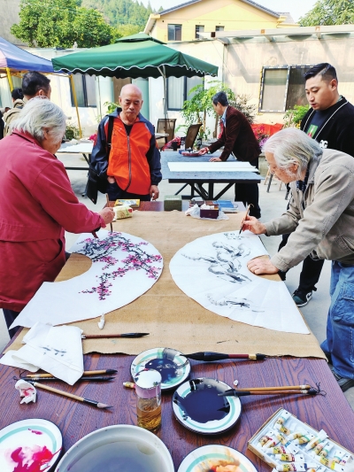 在太乙仙山公园,绵阳市民建经贸总支会员们带上慰问品,邀请书画名家共同为老人们庆祝重阳节。