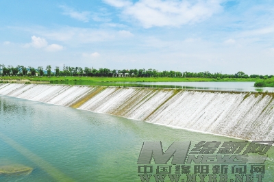 6月19日,记者在绵阳科技城绵盛路一侧安昌河畔看到,清澈的河水翻过大坝,倾泻而下,放眼望去,大片的湿地水草如同一张绿毯铺满两岸,葱葱郁郁,水草中一簇簇绚烂的花朵正随风摇曳,蓝天与白云倒映在水面,美不胜收。