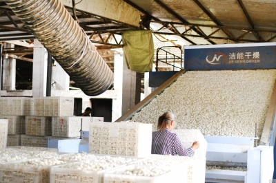 记者随后在烘干车间看到,一箱箱收购来的蚕茧倒入自动烘干设备,经过履带传输,进行工艺烘干处理,现场有条不紊,快捷高效。