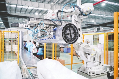 在长虹空调各大生产厂区,全自动机器人下线堆码冷凝器(黄色机械臂)、协作机器人安装空调压缩机(白色机械臂)随处可见。目前,长虹空调拥有行业先进的AT装备400余台(套),大规模优先推动高品质要求、高强度及高危险岗位的机器换人,已实现关键质控点工序智能化设备100%全覆盖,实现关键制程核心数据100%自动采集。