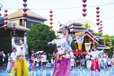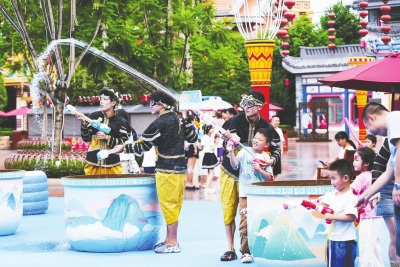 今年暑期,绵阳方特推出的“国风泼水节”为游客一键开启降温模式。进入8月,更是延长开园时间,实现12小时超长营业,夜夜有璀璨烟火。游客在绵阳方特园区可与NPC飚水互动,拥抱清凉水花,也可观赏水龙大秀、水韵鼓舞,体会非遗和民俗魅力。