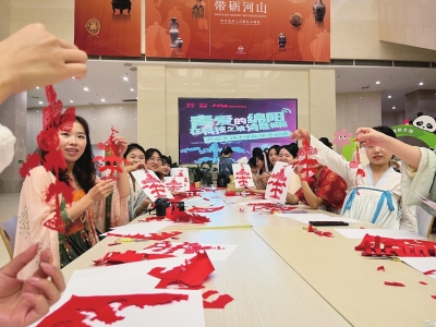 博物馆大厅专门为同学们设置了互动体验区。参观结束后,同学们观摩了书画修复,感受文物修复师的匠心精神。在非遗传承人的指导下,同学们学习剪纸和制作漆扇,感受非遗的神奇。