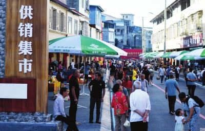 改变,来自以县供销社主导、乡镇党委赋能、基层供销社管理为基础,政企合作打造的金龙供销集市项目。项目修建了美观大方的集市入口,对道路、人行道及公厕等基础设施进行了维修改善,并对整条街60个营业门面进行了统筹规划,建成综合市场集中交易区面积500平方米,固定摊位54个,沿街临时摊位60个,安装照明、纳凉等设施设备,摊位统一设计制作了大型防晒防雨伞具。