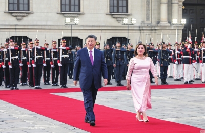 习近平指出,这是我第三次访问秘鲁,也是一年时间里第三次同总统女士会晤。许多秘鲁民众自发聚集道路两旁,挥手致意表示欢迎,让我深切感受到秘鲁人民对中国人民的友好情谊。中秘同为文明古国。古老文明的深厚积淀,赋予中秘两国智慧和胸怀,让我们能够看清历史前进方向,顺应时代发展潮流,始终坚持平等相待、互尊互信、互学互鉴,成为不同体量、不同制度、不同文化国家团结合作的典范。建交53年来,特别是我2016年对秘鲁进行首次国事访问以来,在双方共同努力下,中秘贸易投资合作快速增长,为两国人民带来实实在在的利益。双方要总结经验,推动两国务实合作提质升级,使中秘全面战略伙伴关系不断迈上新台阶,更好造福两国人民。