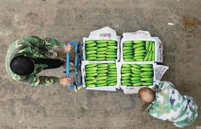 记者跟随种植大户陈纲来到他家的蔬菜大棚看到,藤蔓上挂满了翠绿的水果黄瓜,空气中弥漫着阵阵清香,村民们带着采摘工具,来回穿梭于大棚内,将一筐筐黄瓜运送到分拣区进行集中分拣。陈纲介绍,今年他种植了约20亩的水果黄瓜,这种黄瓜又称水果吊瓜,是近年来流行的新型蔬菜,比普通黄瓜“颜值”高,皮薄且刺少。冲洗后可直接品尝,咬一口“嘎嘣脆”。