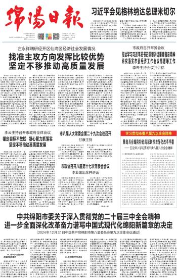 中共绵阳市委八届九次全体会议深入贯彻党的二十届三中全会精神,认真落实省委十二届六次全会决策部署,紧密结合绵阳实际,就进一步全面深化改革、奋力谱写中国式现代化绵阳新篇章进行了研究,作出如下决定。
