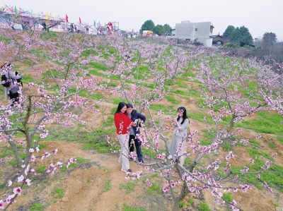 现场游客三五成群,或驻足留影,或悠然赏景,尽情“桃”醉其中。“我在网上看到这里桃花盛开的照片,被美到了。来到这儿发现,桃花开得正好,满山都是,拍照特别出片,这趟来得真值!”游客刘红琼向记者分享道。