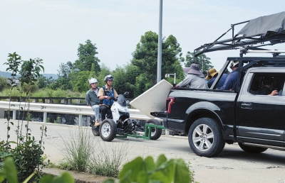 现场,只见芦鑫驾驶摩托车带着吴俊余快速前行,一段拍摄下来,身上的汗水不断,衣服也被汗水湿透。为了确保镜头完美,现场导演兰城序要求“再来一次”,演职人员立即行动起来。看到第二条拍摄画面,兰城序表示满意,随即安排转场进入下一个镜头的拍摄。