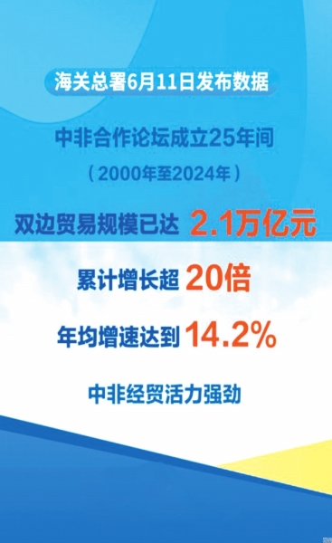 新华社北京6月11日电(记者 张晓洁 邹多为)自2000年中非合作论坛成立以来,中非贸易规模屡创新高。海关总署11日发布数据显示,我国已连续16年保持非洲第一大贸易伙伴国地位,2024年,中非贸易规模首破2万亿元,达到2.1万亿元。